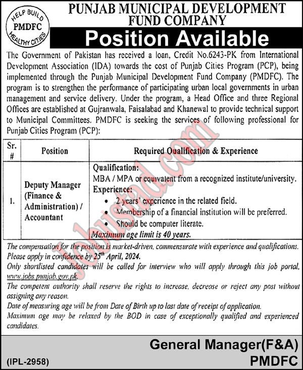 New Accountant Jobs in Lahore April 2024 has been announce through Latest advertisement Punjab Municipal Development Fund Company (PMDFC). The program is to strengthen the performance of participating urban loc=governments in urban management and service delivery. Under the program, a Head Office and three Regional Offices are established at Gujranwala, Faisalabad and Khanewal to provide technical support to Municipal Committees. PMDFC is seeking the services of following professional for Punjab Cities Program (PCP):In these Latest Govt Jobs in Punjab both Male and Female candidates can Apply in these Jobs and can get these New Jobs in Pakistan 2024 after Completion of Jobs Procedure.