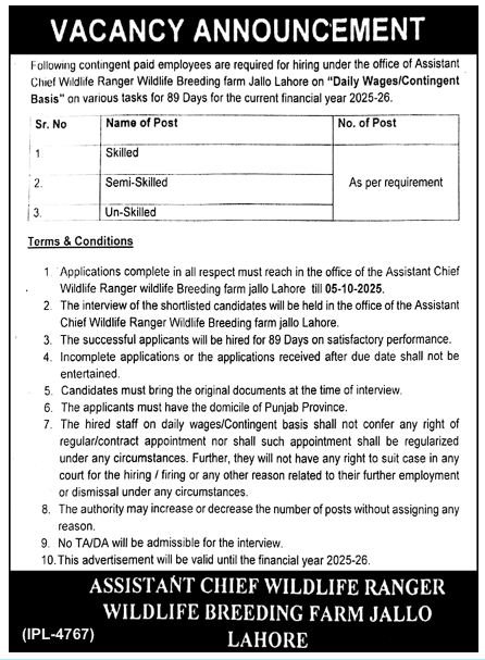 The New Class 4 Vacancies Announce in Lahore September 2025 Advertisement has been released by the Office of Assistant Chief Wildlife Ranger, Wildlife Breeding Farm Jallo, Lahore. Applications are invited for Skilled, Semi-Skilled, and Un-Skilled staff on a contingent/daily wages basis for 89 days only in the financial year 2025-26. This is a short-term opportunity for Punjab-domiciled candidates to contribute to wildlife breeding and conservation activities.