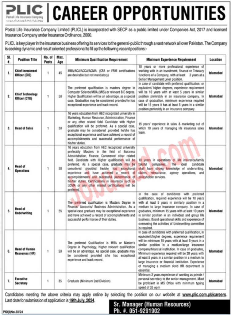 New Postal Life Insurance Company Limited Jobs in Islamabad July 2024 has been announce through latest advertisement PLICL is key player in the insurance business offering its services to the general-public through a vast network all over Pakistan. The Company is seeking dynamic and result oriented professional to fill up the following vacant positions.In these Latest Govt Jobs in Islamabad both Male and Female candidates can Apply in these Jobs and can get these Latest Jobs in Pakistan 2024 after Completion of Jobs Procedure.