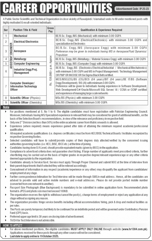 The New Public Sector Organization PSO Jobs in Islamabad October 2025 Advertisement invites applications from dynamic, talented, and result-oriented professionals in engineering, science, and IT fields. This public sector scientific and technical organization, located near Rawalpindi/Islamabad, offers excellent opportunities in Mechanical, Electrical/Electronics, Aerospace, Metallurgy, Computer Engineering, Industrial Engineering/Project Management, Software Development, Physics, and Chemistry. Candidates with BE, B.Sc. Engg., MS, MSc, or BS degrees with a minimum 3.00 CGPA are encouraged to apply online before the closing date. The organization offers fringe benefits including accommodation, medical facilities, and transport, making this an excellent career move for qualified individuals.
