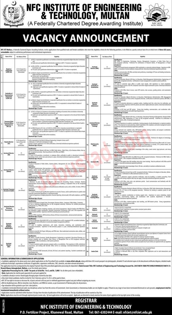 The NFC Institute of Engineering and Technology (NFCIET) Multan, a federally chartered degree-awarding institute, has announced multiple job vacancies on a contract basis for qualified male and female candidates. This NFC Institute of Engineering and Technology Jobs in Multan August 2025 Advertisement offers excellent opportunities for experienced professionals in academic and administrative roles including Registrar, Controller of Examinations, Assistant Controller, Directorates, Technicians, Clerical Staff, and more. The positions will be filled initially for three (03) years, extendable based on performance and institutional requirements. Interested applicants are encouraged to apply before the closing date.