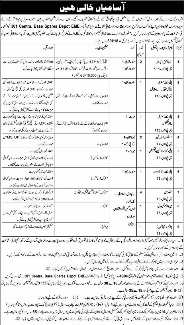 Pak Army 301 Central Base Spares Depot EME Jobs in Rawalpindi March 2026