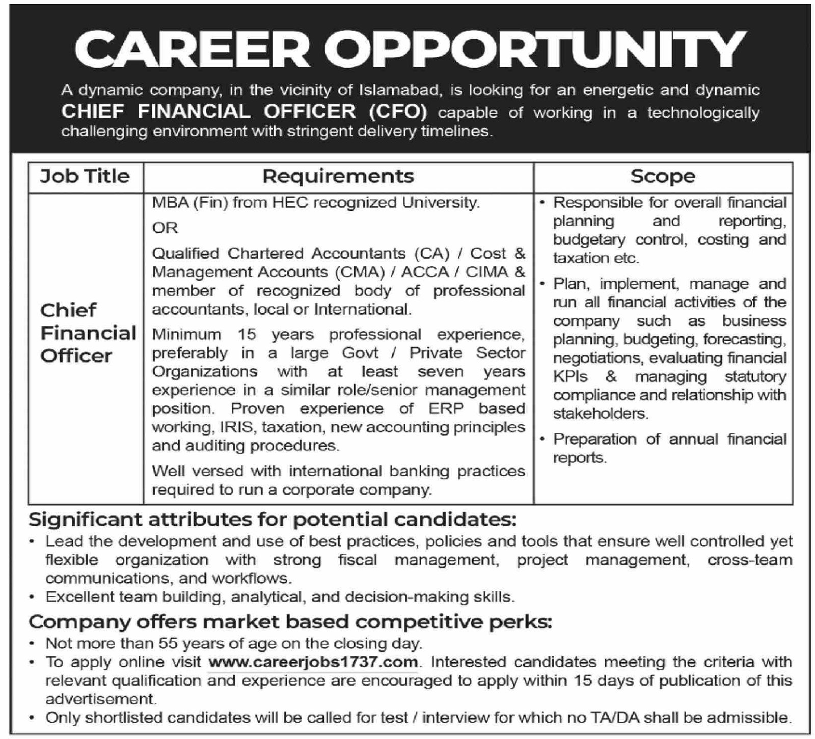 The Pakistan Atomic Energy Commission Jobs March 2026 Advertisement announces an excellent leadership opportunity for experienced finance professionals. A dynamic organization located near Islamabad is seeking a highly qualified and energetic Chief Financial Officer (CFO) who can manage complex financial operations in a technologically advanced environment with strict delivery timelines. Candidates with strong expertise in financial planning, taxation, auditing procedures, ERP systems, and international banking practices are encouraged to apply. The company offers competitive market-based perks and is looking for professionals with extensive experience in senior financial management roles.