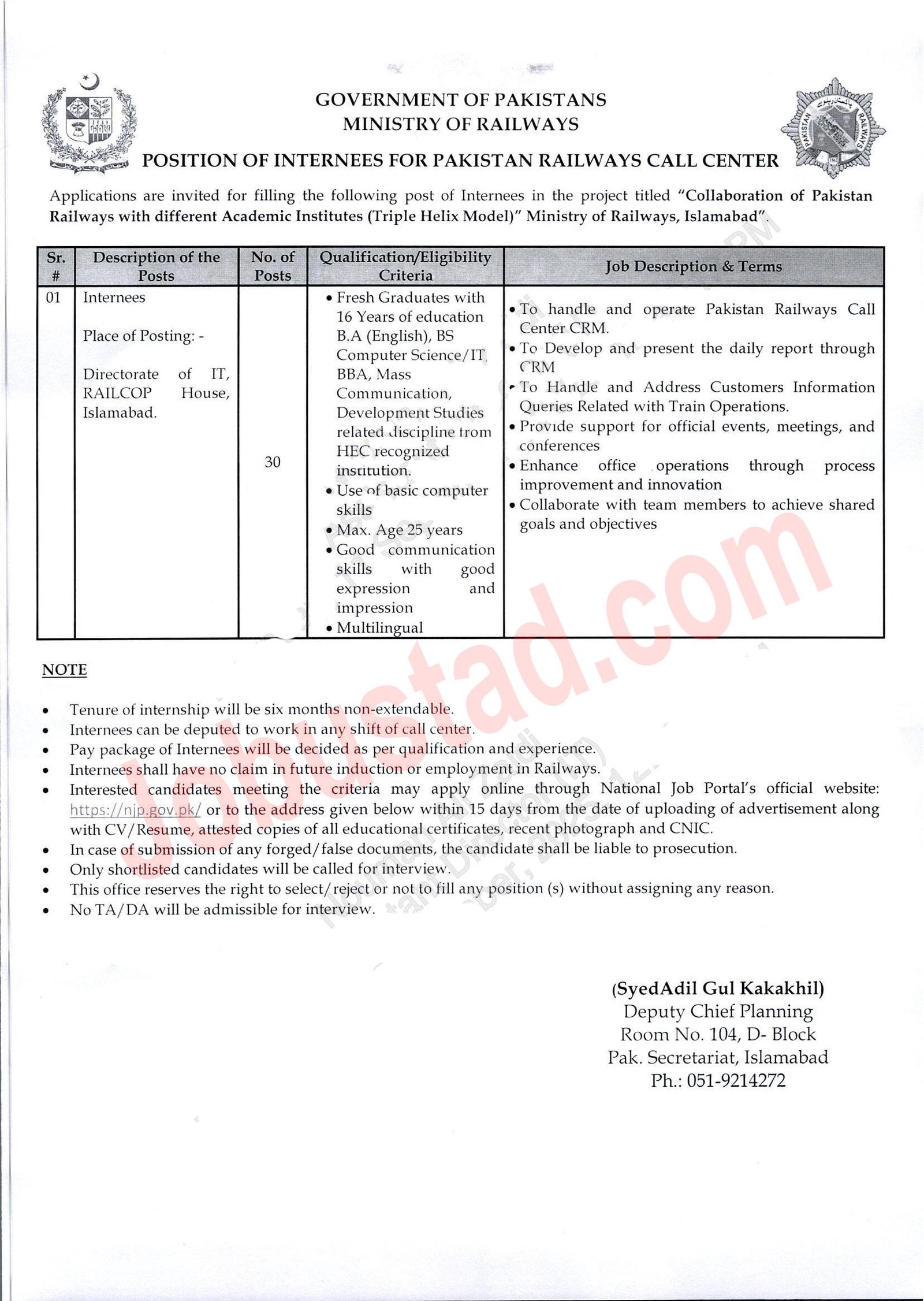 he Government of Pakistan, Ministry of Railways has announced the Pakistan Railways Internships Program September 2025 Advertisement, offering fresh graduates a golden opportunity to gain hands-on experience in a professional environment. These internships are part of the project “Collaboration of Pakistan Railways with Different Academic Institutes (Triple Helix Model)”. With 30 positions available at the Pakistan Railways Call Center, Islamabad, this program is designed to engage young graduates with skills in English, Computer Science, IT, BBA, Mass Communication, and Development Studies. The six-month internship aims to equip participants with professional exposure in customer service, reporting, teamwork, and CRM systems.