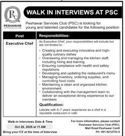 Peshawar Services Club (PSC) has announced exciting career opportunities for young and talented individuals through its Walk-in Interviews recruitment drive. This Peshawar Services Club Vacancies October 2025 Advertisement invites candidates to apply for the position of Executive Chef, offering a chance to showcase culinary expertise in a professional and reputable environment. The club is looking for passionate professionals with proven experience who can manage kitchen operations, deliver high-quality dishes, and enhance members’ dining experiences.
