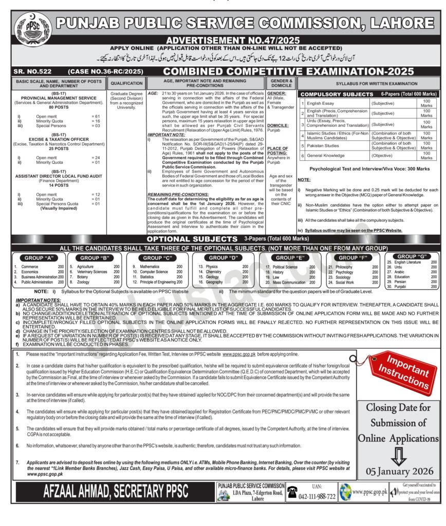 The Punjab Public Service Commission (PPSC) has officially announced the Combined Competitive Examination (CCE) 2025 through Advertisement No. 47/2025, published in newspapers on 14 December 2025. This prestigious competitive examination offers a direct opportunity for graduates domiciled in Punjab to secure BS-17 officer-level positions in key provincial departments, including Provincial Management Service (PMS), Excise & Taxation, and Local Fund Audit. With a transparent selection process, province-wide postings, and equal opportunities for male, female, and transgender candidates, the PPSC Combined Competative Examination 2025 Registration Open notice is a major career milestone for aspiring civil servants seeking authority, stability, and long-term growth in public service.