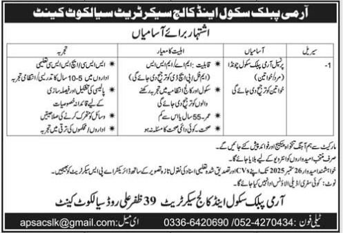 Interested candidates should send their CV, attested copies of academic certificates, and a recent passport-size photograph to the Director, APS Secretariat, Sialkot Cantt by 26 September 2025. Applications may also be sent via email at apsacslk@gmail.com.