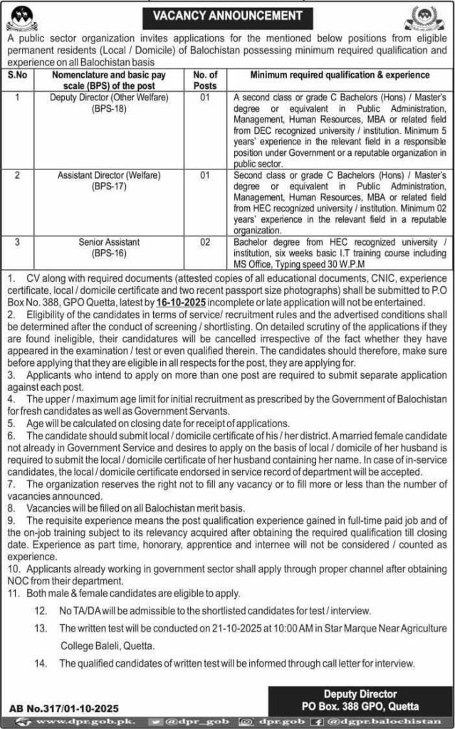 The Public Sector Organization Jobs in Quetta September 2025 Advertisement invites applications from eligible, qualified, and experienced individuals who are permanent residents of Balochistan. These opportunities are announced on an all Balochistan merit basis for multiple positions including Deputy Director, Assistant Director, and Senior Assistant. The positions are available for candidates with academic backgrounds in Public Administration, Management, Human Resources, MBA, or related fields. Interested candidates are required to submit their applications before the deadline, ensuring they meet all eligibility conditions set by the organization