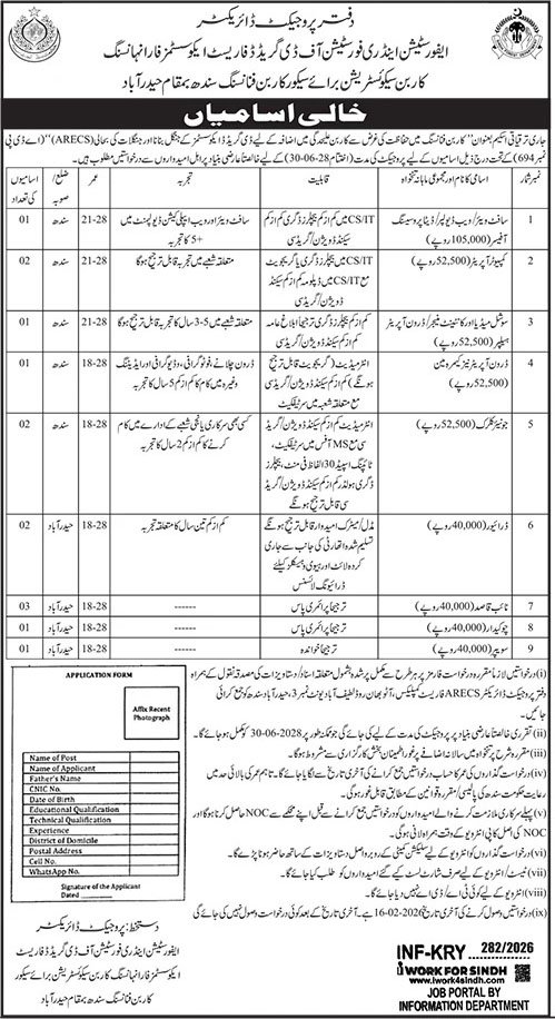 The Public Sector Organization Jobs in Sindh January 2026 Advertisement has been officially announced by the Office of the Project Director, Afforestation and Reforestation of Degraded Forest Ecosystems for Enhancing Carbon Sequestration for Secure Carbon Financing (ARECS), Sindh, Hyderabad. Applications are invited from eligible, qualified, and motivated candidates on a purely temporary contract basis for the duration of the ADP development project (ADP No. 694), which is expected to continue up to 30 June 2028. These jobs offer attractive monthly salaries and an excellent opportunity to work on an internationally relevant climate change, forestry, and carbon financing project under the Government of Sindh.