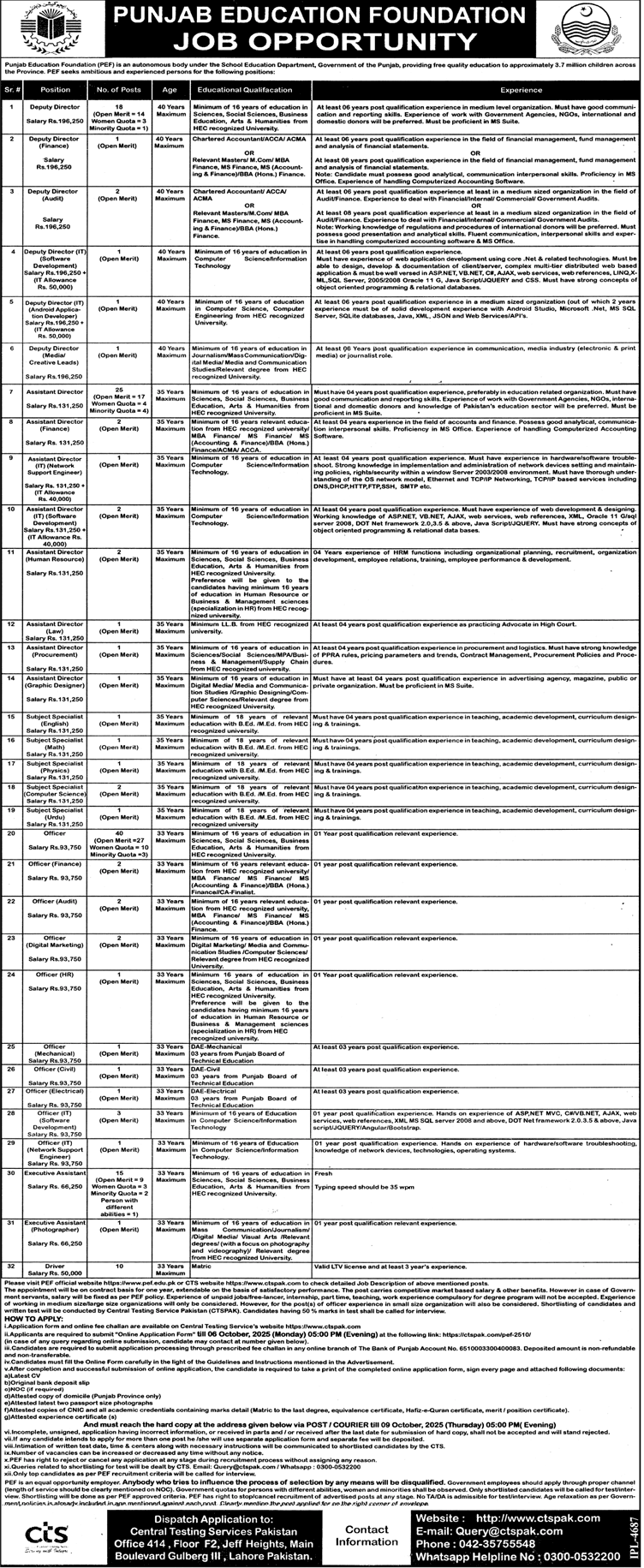 The Punjab Education Foundation (PEF) has announced new career opportunities in September 2025 through Central Testing Services (CTS). This latest Punjab Education Foundation PEF Jobs September 2025 Advertisement invites applications from suitable candidates for various positions under merit-based recruitment. Interested applicants are encouraged to apply within the due date by submitting their documents through CTS. The recruitment process is strictly transparent, and only eligible candidates will be shortlisted for the next stages.