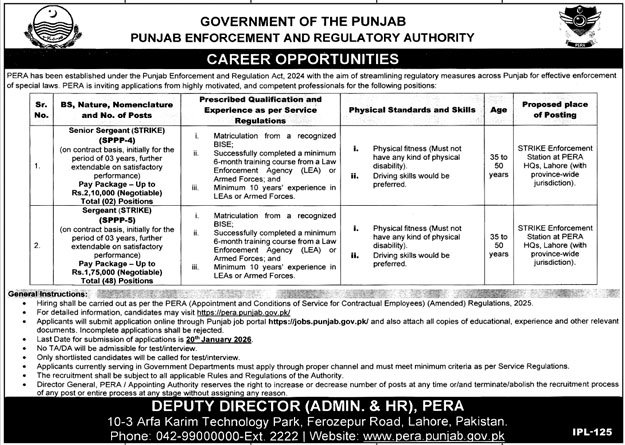 Punjab Enforcement and Regulatory Authority Jobs January 2026 offer a strong career opportunity for experienced and disciplined professionals who have served in Law Enforcement Agencies (LEAs) or the Armed Forces. The Punjab Enforcement and Regulatory Authority (PERA), established under the Punjab Enforcement and Regulation Act, 2024, aims to streamline regulatory measures and ensure effective enforcement of special laws across Punjab. PERA is inviting applications for contract-based enforcement positions with attractive salary packages, long-term extensions based on performance, and province-wide jurisdiction, making this an excellent opportunity for motivated candidates seeking government sector roles.