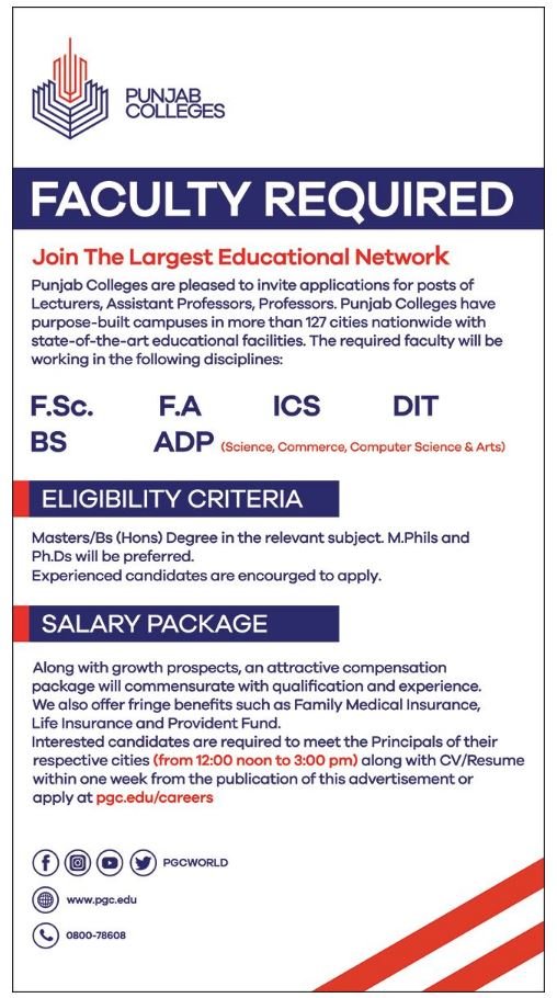 Punjab Colleges is hiring Lecturers in various disciplines including Science, Commerce, Computer Science, and Arts. Candidates must hold at least a BS (Hons) or Master’s degree in the relevant subject. Teaching experience will be an added advantage.