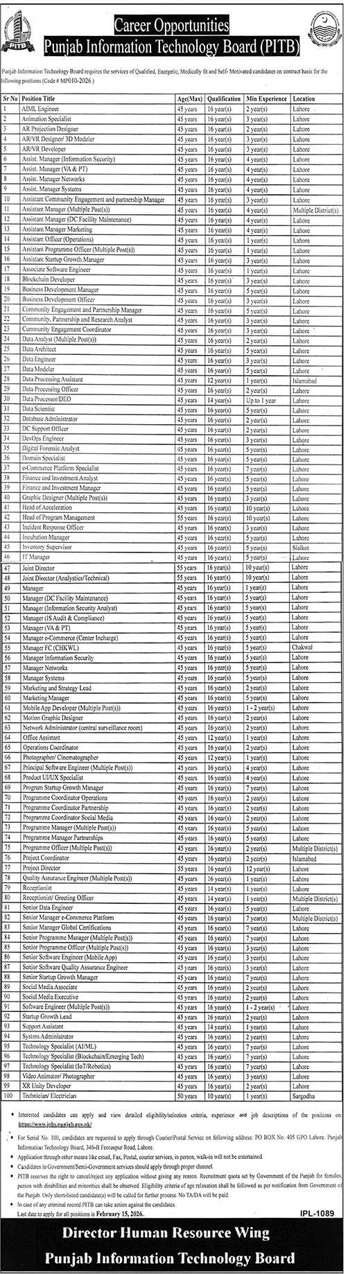 Punjab Information Technology Board (PITB) has officially announced Punjab IT Board Jobs February 2026 for highly qualified, energetic, medically fit, and self-motivated professionals on a contract basis under Advertisement Code MP010-2026. This large-scale recruitment drive offers 100+ vacancies in IT, software development, data science, cybersecurity, management, operations, media, and support roles across Lahore, Islamabad, Sialkot, Chakwal, Sargodha, and multiple districts of Punjab. PITB provides an excellent opportunity to work on impactful government technology projects while building a strong professional career in Pakistanโ€™s leading public-sector IT organization.