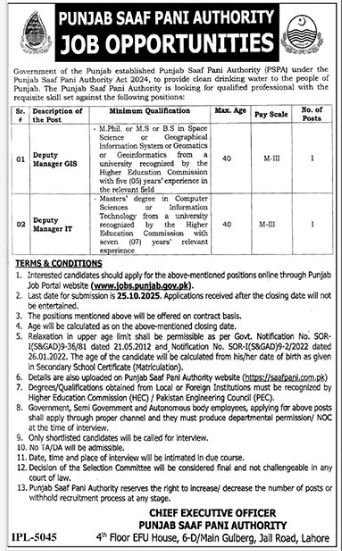 The Punjab Saaf Pani Authority (PSPA), established under the Punjab Saaf Pani Authority Act 2024, has announced fresh job opportunities for skilled professionals through the Punjab Saaf Pani Authority Vacancies October 2025 Advertisement. This initiative aims to hire qualified individuals to support the mission of providing clean drinking water across Punjab. Candidates meeting the required qualifications and experience are encouraged to apply online before the deadline.