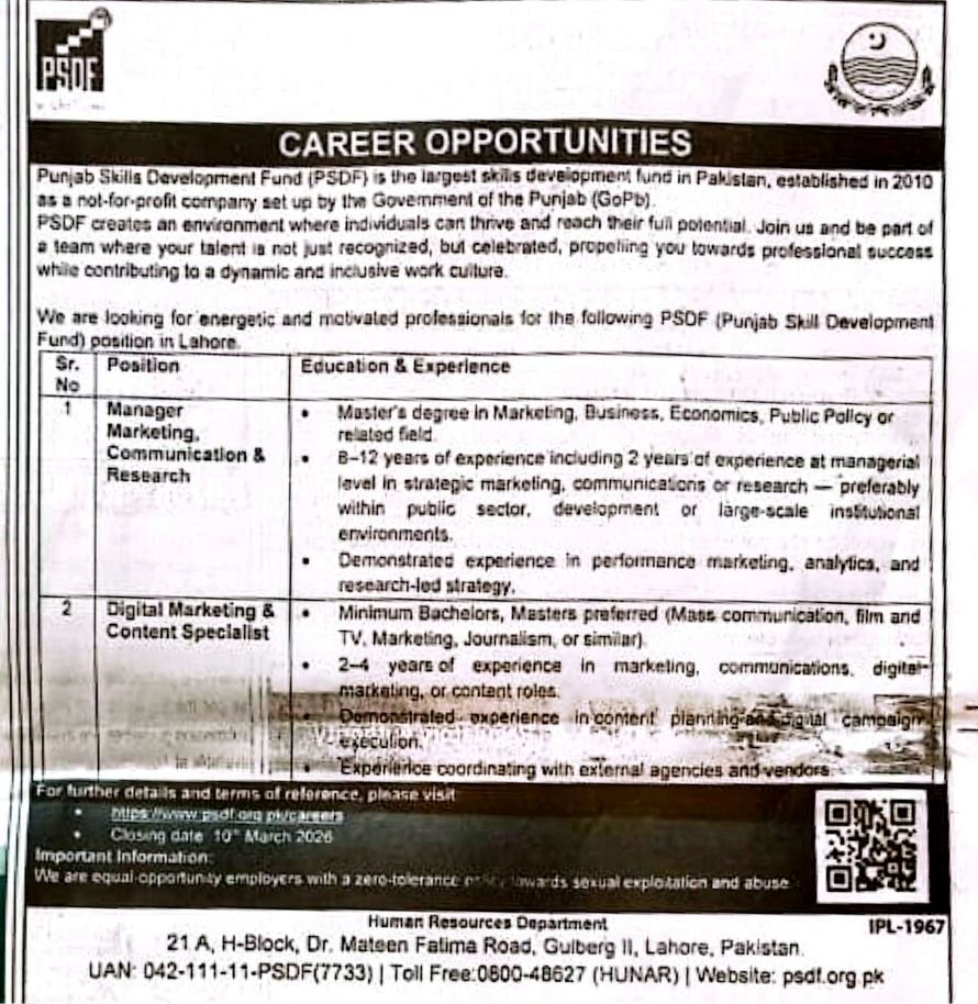 The Punjab Skills Development Fund PSDF Jobs March 2026 Advertisement has been officially announced by the Punjab Skills Development Fund (PSDF), the largest skills development fund in Pakistan established in 2010 by the Government of Punjab as a not-for-profit company. PSDF is inviting applications from energetic, qualified, and motivated professionals for key marketing and digital communication roles based in Lahore. This is a valuable opportunity to join a dynamic, inclusive, and growth-oriented organization that promotes professional excellence while contributing to skills development across Punjab. Interested candidates must apply before 10 March 2026