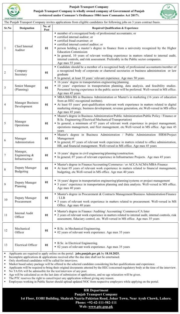 Punjab Transport Company Vacancies October 2025 Advertisement Punjab Transport Company is wholly owned company of Government of Punjab registered under Company’s Ordinance 1984 (now Comnanies Act 2017).