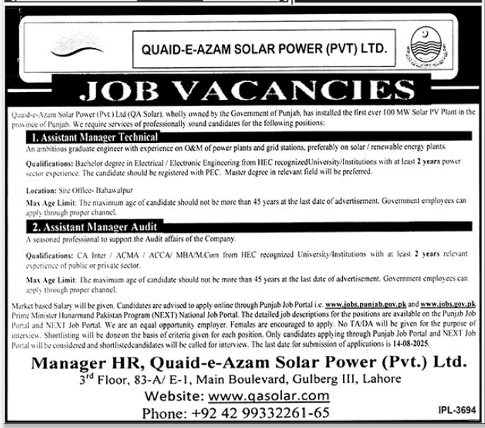 Quaid-e-Azam Solar Power (Pvt.) Ltd., a government-owned entity, is seeking skilled and motivated professionals for multiple job openings. As the proud developer of Punjab’s first 100 MW Solar PV Plant, the company is offering exciting career opportunities under the Quaid e Azam Solar Power Company Jobs in Lahore July 2025 Advertisement. The openings include positions for Assistant Manager Technical and Assistant Manager Audit for their Lahore head office and Bahawalpur site office. Market-based salaries, growth opportunities, and a professional work environment await the selected candidates. Applications are invited through the Punjab Job Portal and National Job Portal (NEXT) before the deadline of 14th August 2025. Candidates, especially females, are encouraged to apply for these government sector energy jobs.