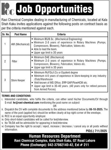 Ravi Chemical Complex, a reputed chemical manufacturing industry located at Kala Shah Kaku, Lahore, has announced multiple job opportunities in September 2025. The organization is inviting applications on a contract basis for technical and support staff including AM (Mechanical), Fitter, and Store Keeper. Candidates with relevant educational qualifications and hands-on industrial experience are encouraged to apply before the closing date. This is an excellent opportunity for professionals seeking growth in a well-established industry.