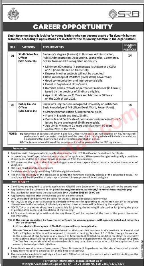 The Sindh Revenue Board (SRB) has announced new career opportunities for young and talented individuals through the Sindh Revenue Board Vacancies October 2025 Apply Online advertisement. Applications are invited for the positions of Sindh Sales Tax Officer (SRB Scale-16) and Public Liaison Officer (SRB Scale-14). These roles offer excellent career prospects in a dynamic organization, providing growth opportunities, professional development, and a chance to contribute to Sindh’s revenue system. Eligible candidates holding domicile of Sindh are encouraged to apply online before the closing date.