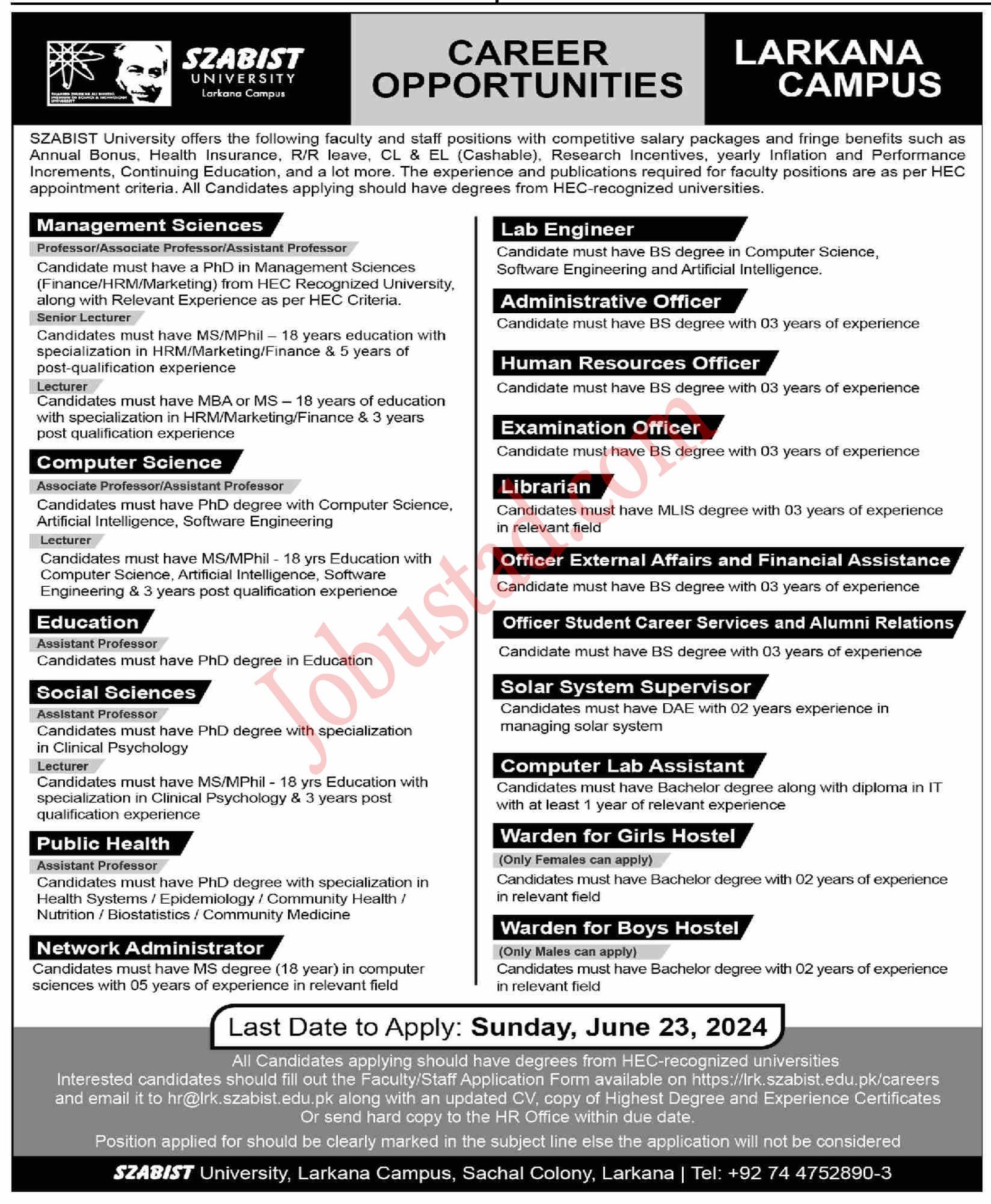 SZABIST University Jobs n Larkana Campus June 2024 Advertisement
