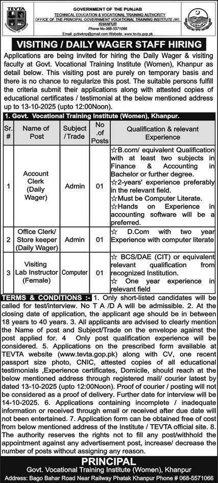 The Government of Punjab’s Technical Education & Vocational Training Authority (TEVTA) has announced new TEVTA Vacancies Open in Khanpur October 2025 Advertisement for Daily Wager and Visiting Faculty staff at the Government Vocational Training Institute (Women), Khanpur. These positions are temporary and will not be regularized. Eligible candidates with the required qualifications and relevant experience are invited to apply before 13th October 2025 (up to 12:00 Noon). The hiring aims to engage skilled and qualified individuals for administrative and instructional roles.