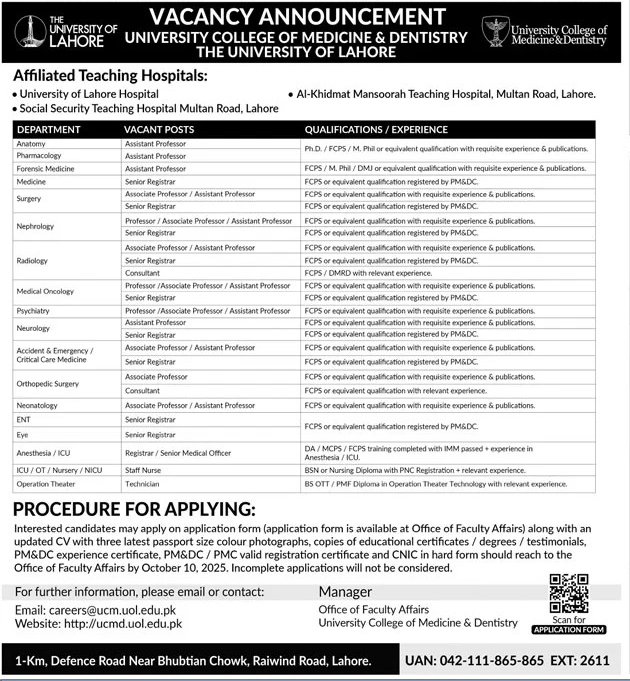 The University of Lahore Vacancies October 2025 Apply Online announcement invites applications for multiple teaching faculty and medical staff positions at the University College of Medicine & Dentistry (UCMD). These opportunities cover diverse departments such as Anatomy, Surgery, Radiology, Medical Oncology, Psychiatry, Critical Care, Orthopedic Surgery, and more. The affiliated teaching hospitals include University of Lahore Hospital, Social Security Teaching Hospital Multan Road Lahore, and Al-Khidmat Mansoorah Teaching Hospital. Eligible candidates with FCPS, Ph.D., M.Phil, MCPS, DA, or equivalent qualifications along with requisite experience and publications are encouraged to apply before the deadline.