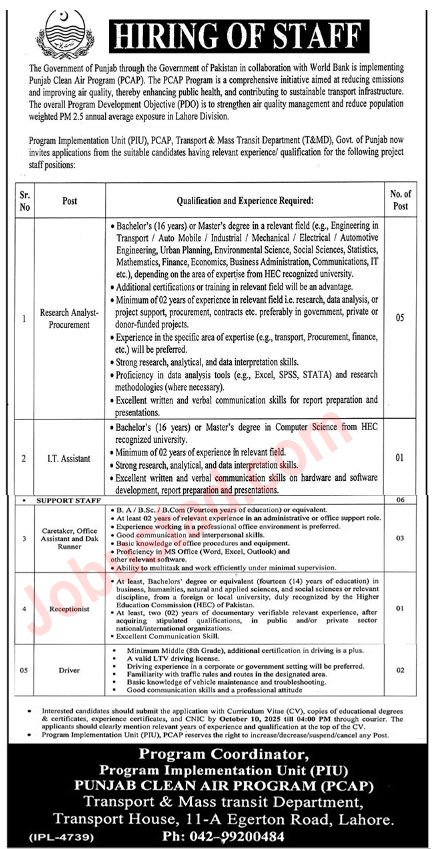 The latest Transport and Mass Transit Department Jobs in Punjab September 2025 Advertisement has been announced under the Punjab Clean Air Program (PCAP), a collaborative initiative of the Government of Punjab, Government of Pakistan, and World Bank. The program aims to strengthen air quality management, reduce emissions, and improve public health in Lahore Division. The Program Implementation Unit (PIU), PCAP, is inviting applications from highly qualified and motivated candidates for multiple positions including Research Analysts, IT Assistant, Support Staff, Receptionist, and Drivers. This is an excellent opportunity to contribute to a sustainable and impactful environmental project