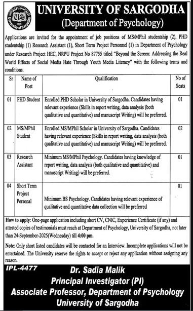 The University of Sargodha (UOS), Department of Psychology, has announced multiple research-based job opportunities under the HEC NRPU Project No. 87755 titled “Beyond the Screen: Addressing the Real World Effects of Social Media Hate Through Youth Media Literacy.” The University of Sargodha UOS Vacancies September 2025 Advertisement invites applications for MS/MPhil studentships, PhD studentship, Research Assistant, and Short-Term Project Personnel positions. Eligible candidates enrolled at UOS with strong academic and research backgrounds, particularly in data analysis, report writing, and manuscript preparation, are encouraged to apply before the deadline.