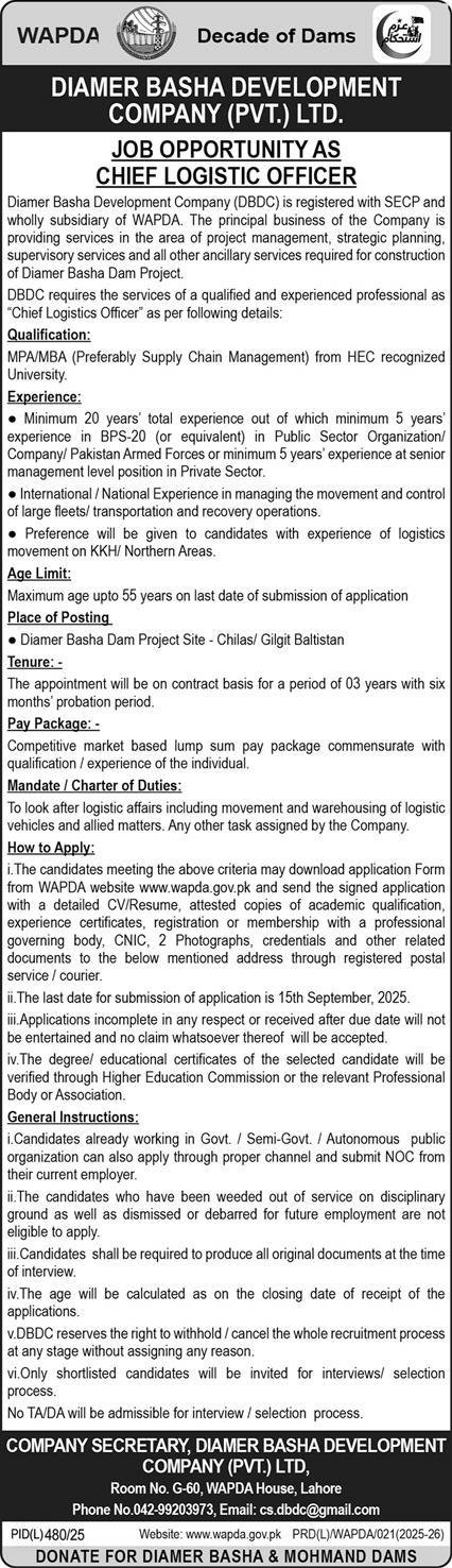 The Diamer Basha Development Company (DBDC), a wholly owned subsidiary of WAPDA, has announced a key vacancy for the position of Chief Logistic Officer. This prestigious role is based at the Diamer Basha Dam Project Site in Gilgit-Baltistan and offers a market-based competitive salary package. Candidates with strong professional backgrounds in supply chain, logistics, and fleet management are encouraged to apply before 15th September 2025. This is an excellent opportunity to contribute to one of Pakistan’s most significant national projects under WAPDA’s Decade of Dams initiative.